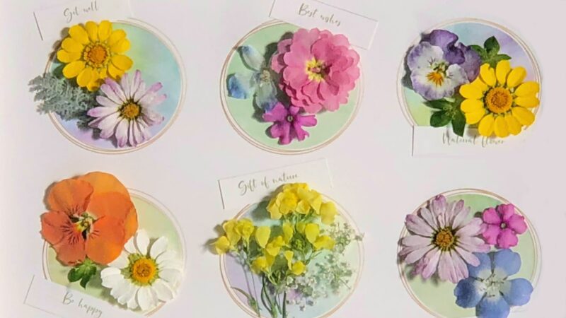 いろいろな植物をきれいな色のまま乾燥させ、押し花絵にします。現在では密封技術が進み変色せずにアートとして楽しめます。