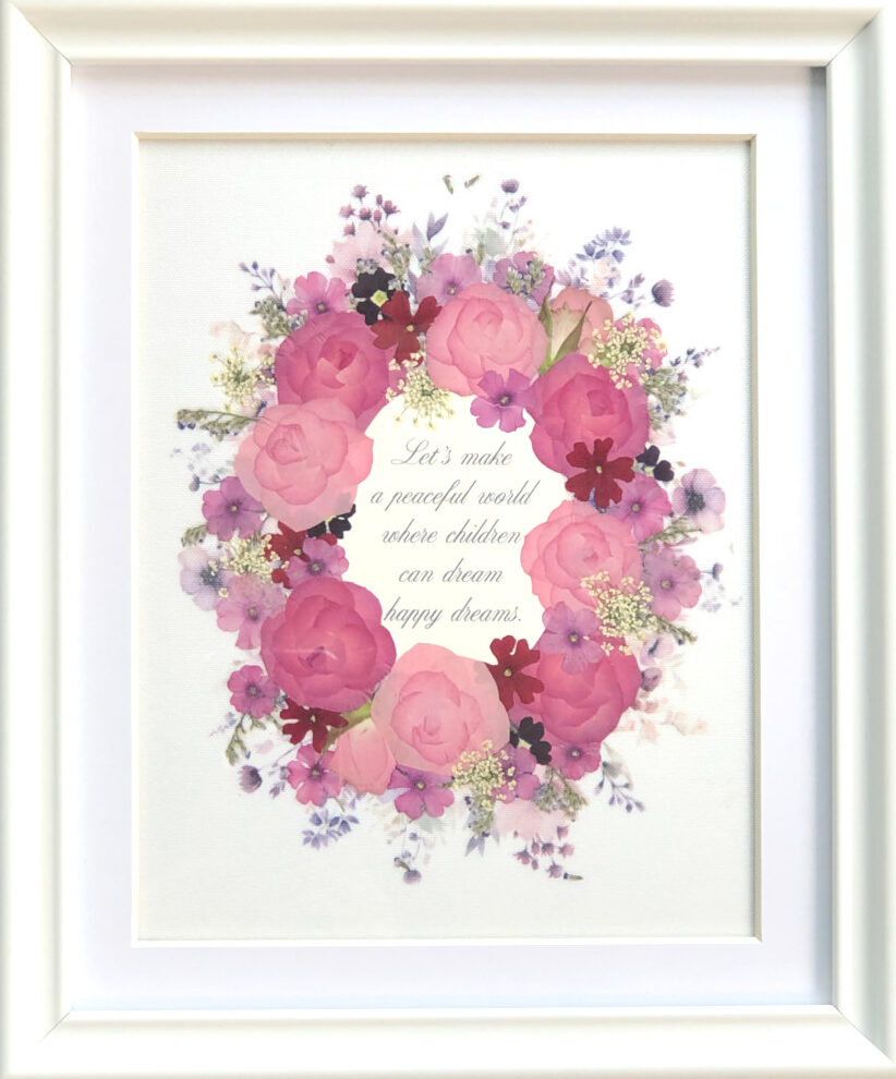 台紙は布に押し花プリント(SDシートミックスB)で花模様を染めたものを使用しましたのでかわいい+おしゃれな作品になったように思います。