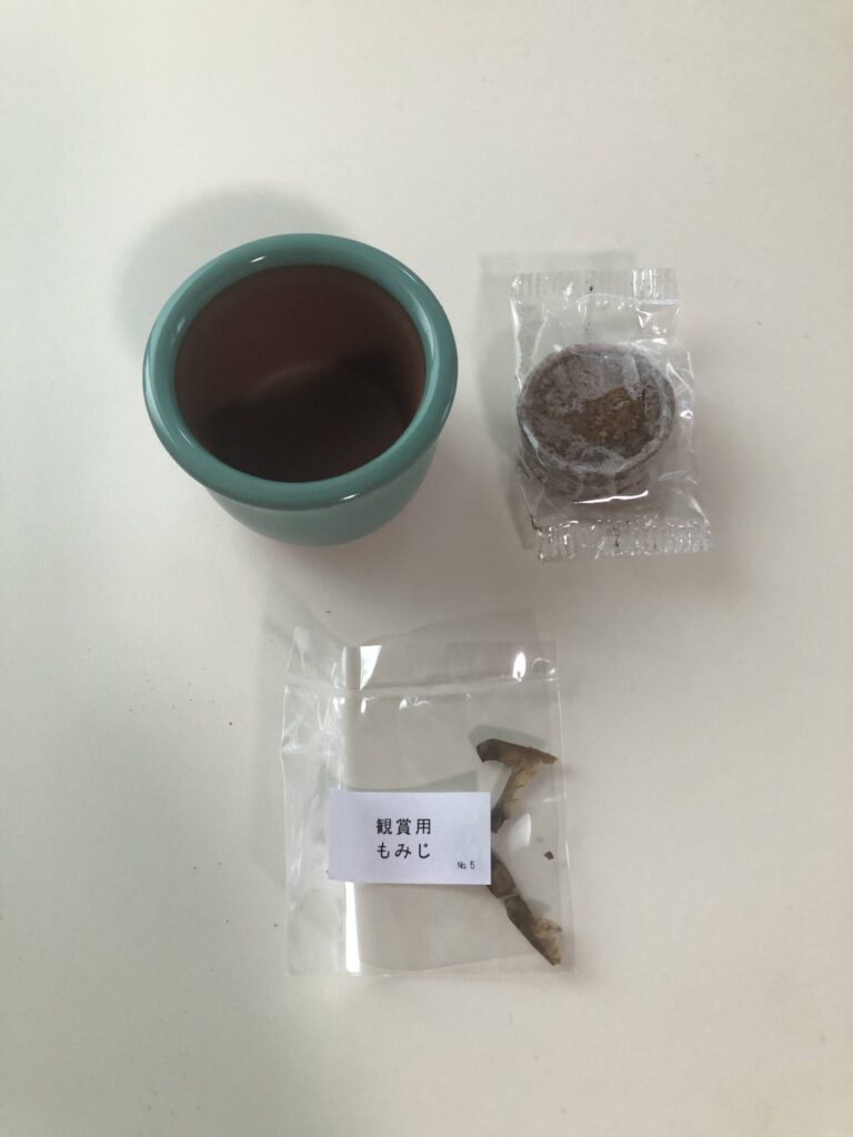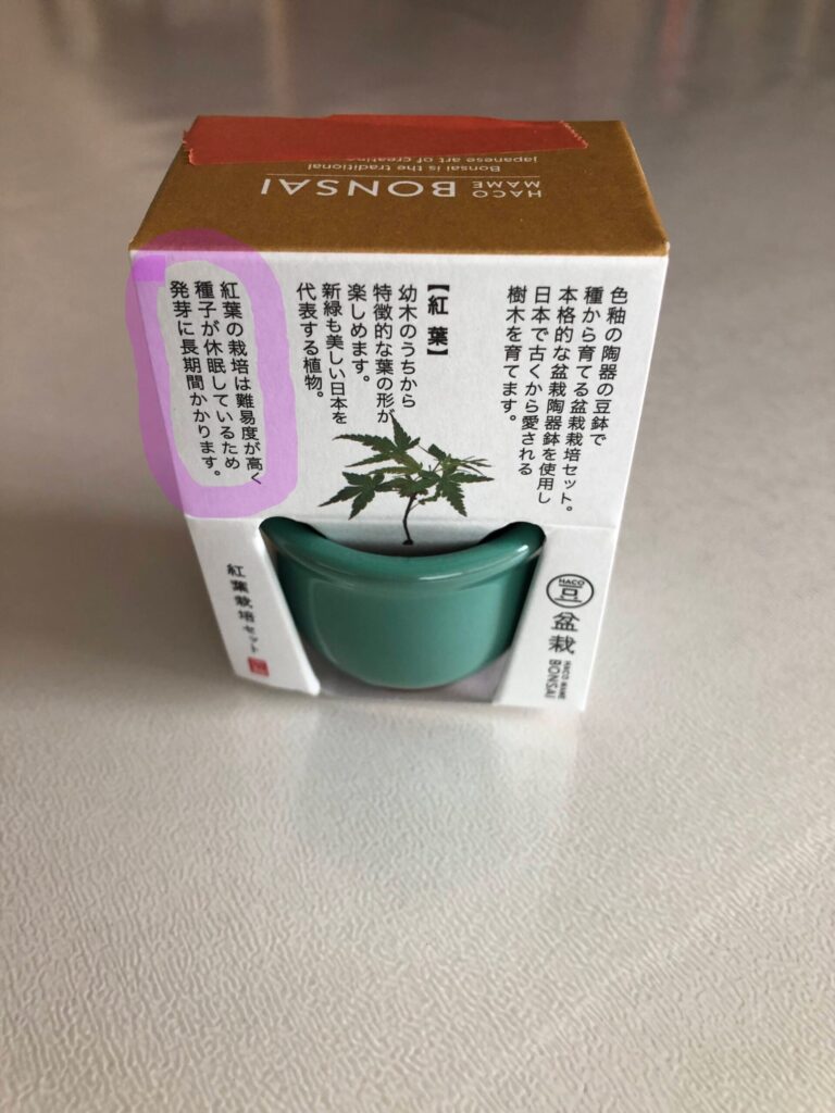 先日観光地に出かけお土産を物色していましたら盆栽キットがあったのでなぜか買ってしまいました。もみじ、黒松、赤松、のなかからもみじを選びました。(5色とうがらしもあるそうですがこの棚にはありませんでした)