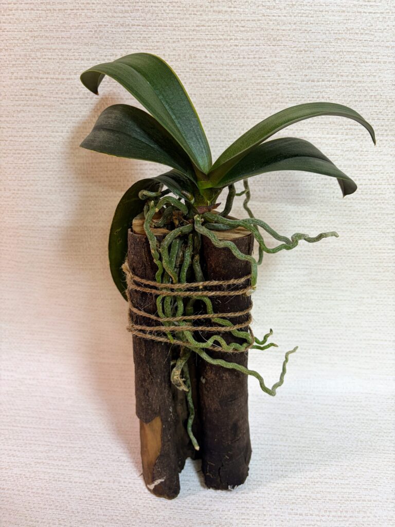 さすがにぼんやり者の私でも「これは根だな」と思うに至り、鉢から取り出して、これもどこかで拾ってきた焚き火用の木に、麻紐で縛り付けました。
