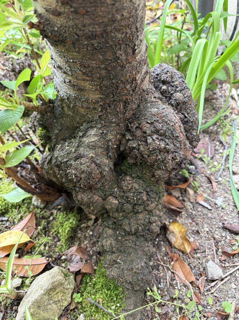 ところが最近、ソメイヨシノが枯れているという話を耳にし、我が家の桜を見てみると、根頭がんしゅ病と思われる状態でした。